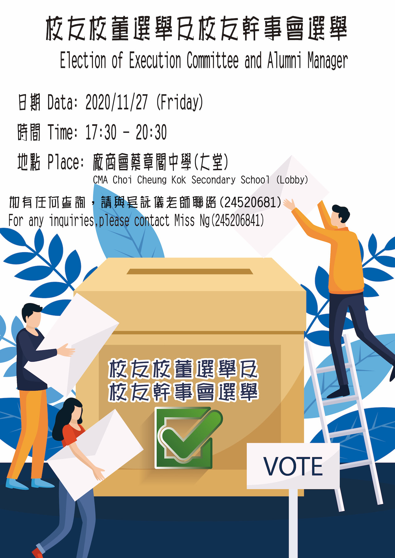 各位校友,11月27日係校友校董及第八屆校友幹事會既換屆選舉,今年因疫情關係,未能安排聚餐/BBQ活動,但都希望大家多多支持選舉!詳情請參閱宣導海報。